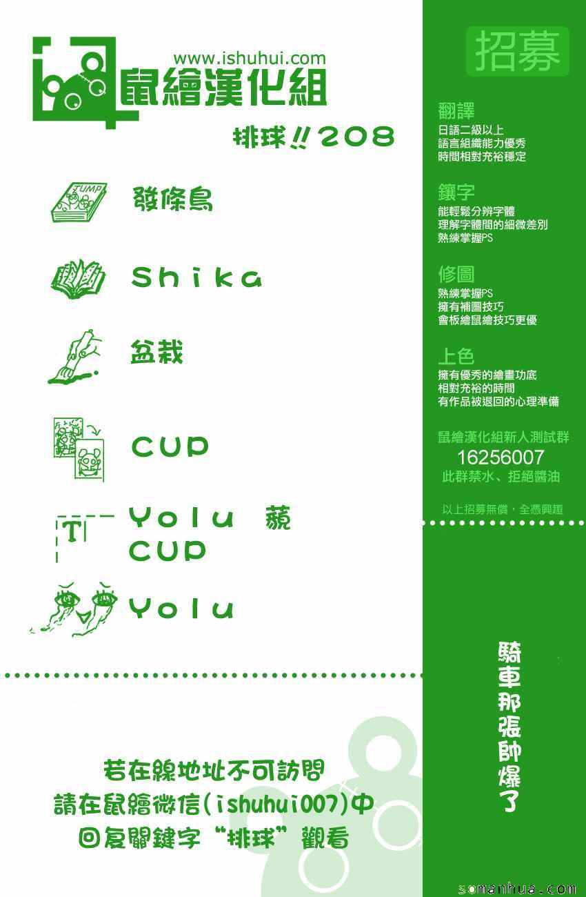 排球少年208話漫畫來自網友分享和上傳,以便漫畫愛好者研究排球少年208話漫畫畫法技巧和構圖方式。若喜歡漫畫,請支持購買正版!若侵犯到您的權益,請立即聯繫我們刪除