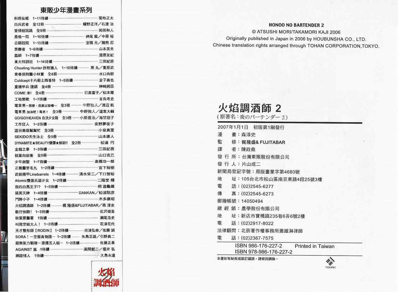火焰調酒師02卷漫畫來自網友分享和上傳,以便漫畫愛好者研究火焰調酒師02卷漫畫畫法技巧和構圖方式。若喜歡漫畫,請支持購買正版!若侵犯到您的權益,請立即聯繫我們刪除