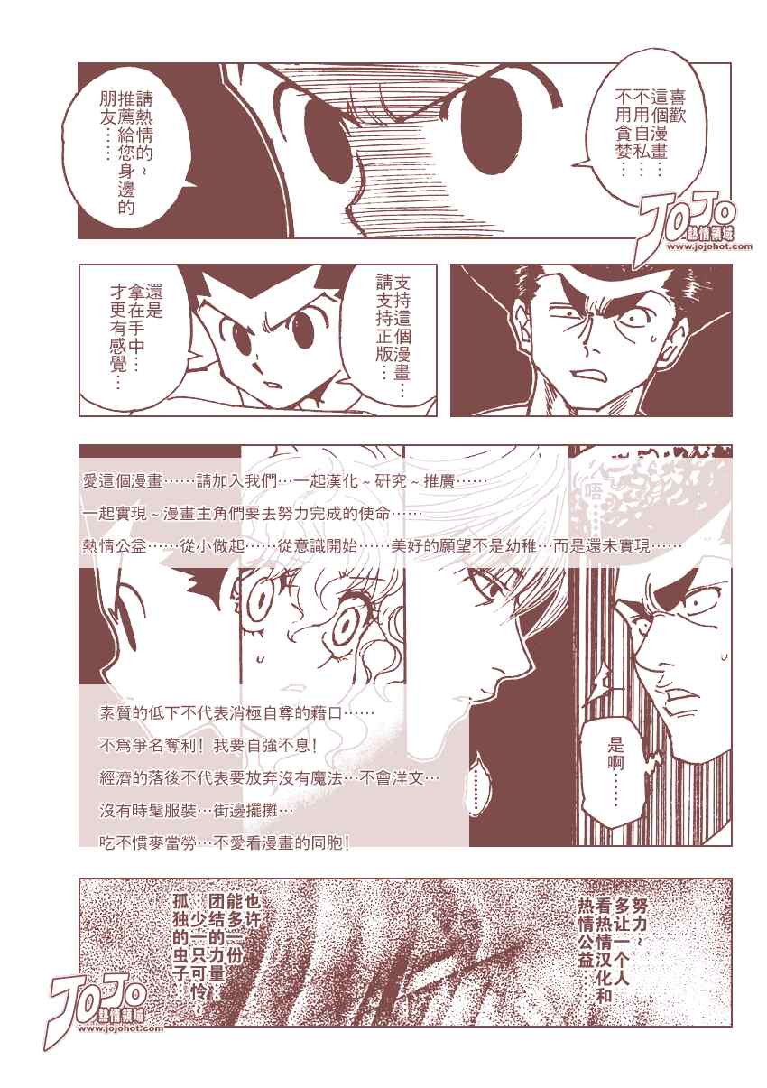 獵人hunterxhunter295集漫畫來自網友分享和上傳,以便漫畫愛好者研究獵人hunterxhunter295集漫畫畫法技巧和構圖方式。若喜歡漫畫,請支持購買正版!若侵犯到您的權益,請立即聯繫我們刪除