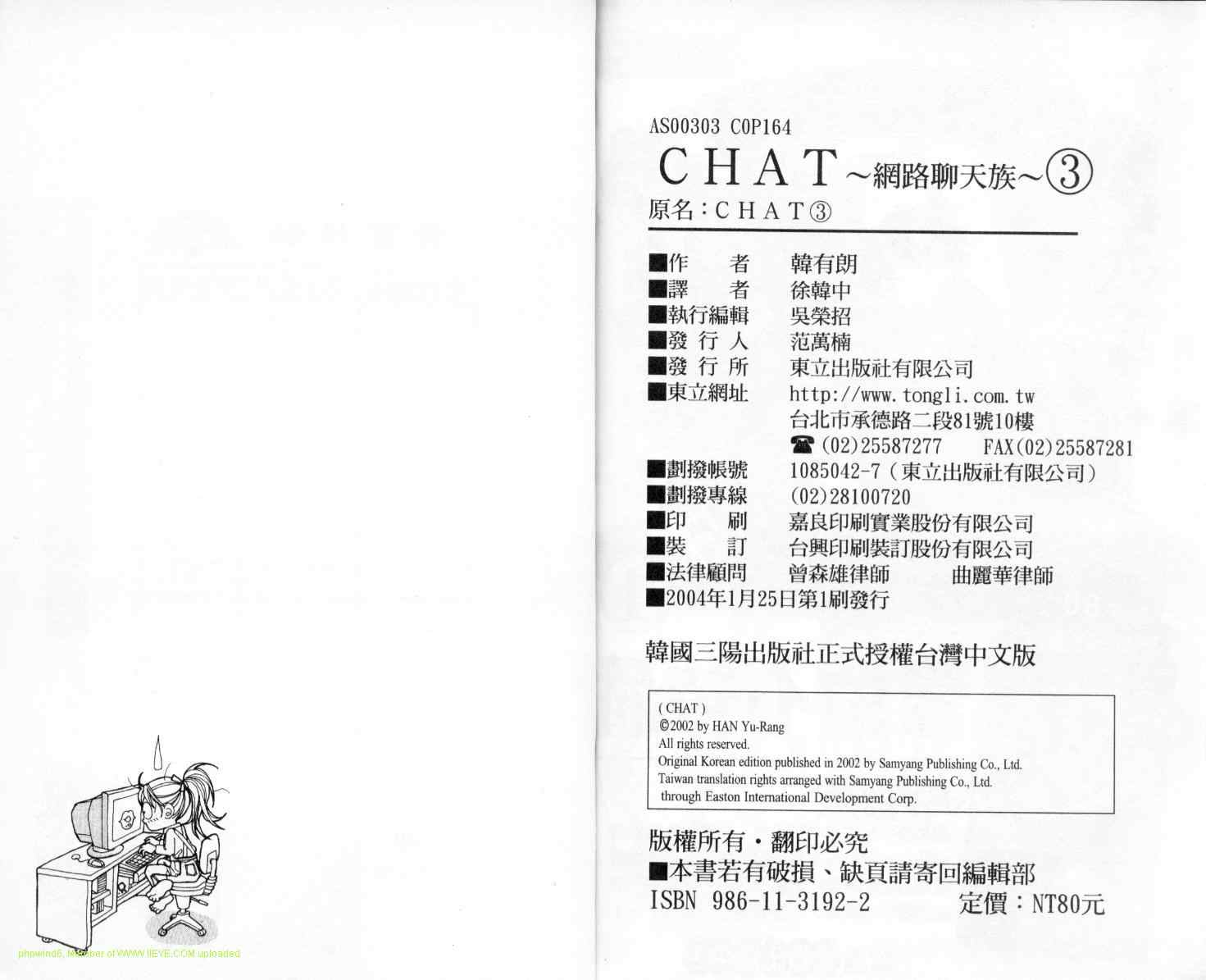 網絡聊天族chat03卷漫畫來自網友分享和上傳,以便漫畫愛好者研究網絡聊天族chat03卷漫畫畫法技巧和構圖方式。若喜歡漫畫,請支持購買正版!若侵犯到您的權益,請立即聯繫我們刪除