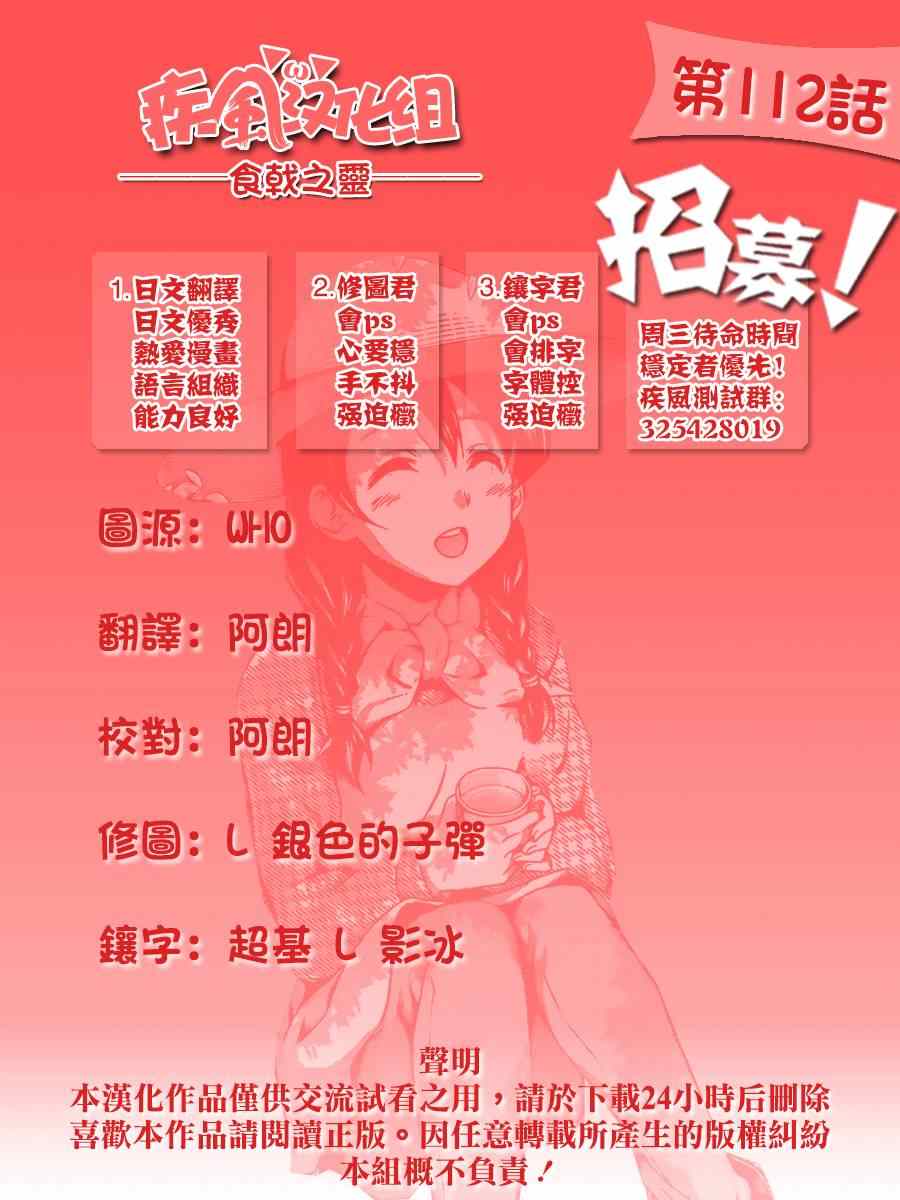 食戟之靈112集漫畫來自網友分享和上傳,以便漫畫愛好者研究食戟之靈112集漫畫畫法技巧和構圖方式。若喜歡漫畫,請支持購買正版!若侵犯到您的權益,請立即聯繫我們刪除