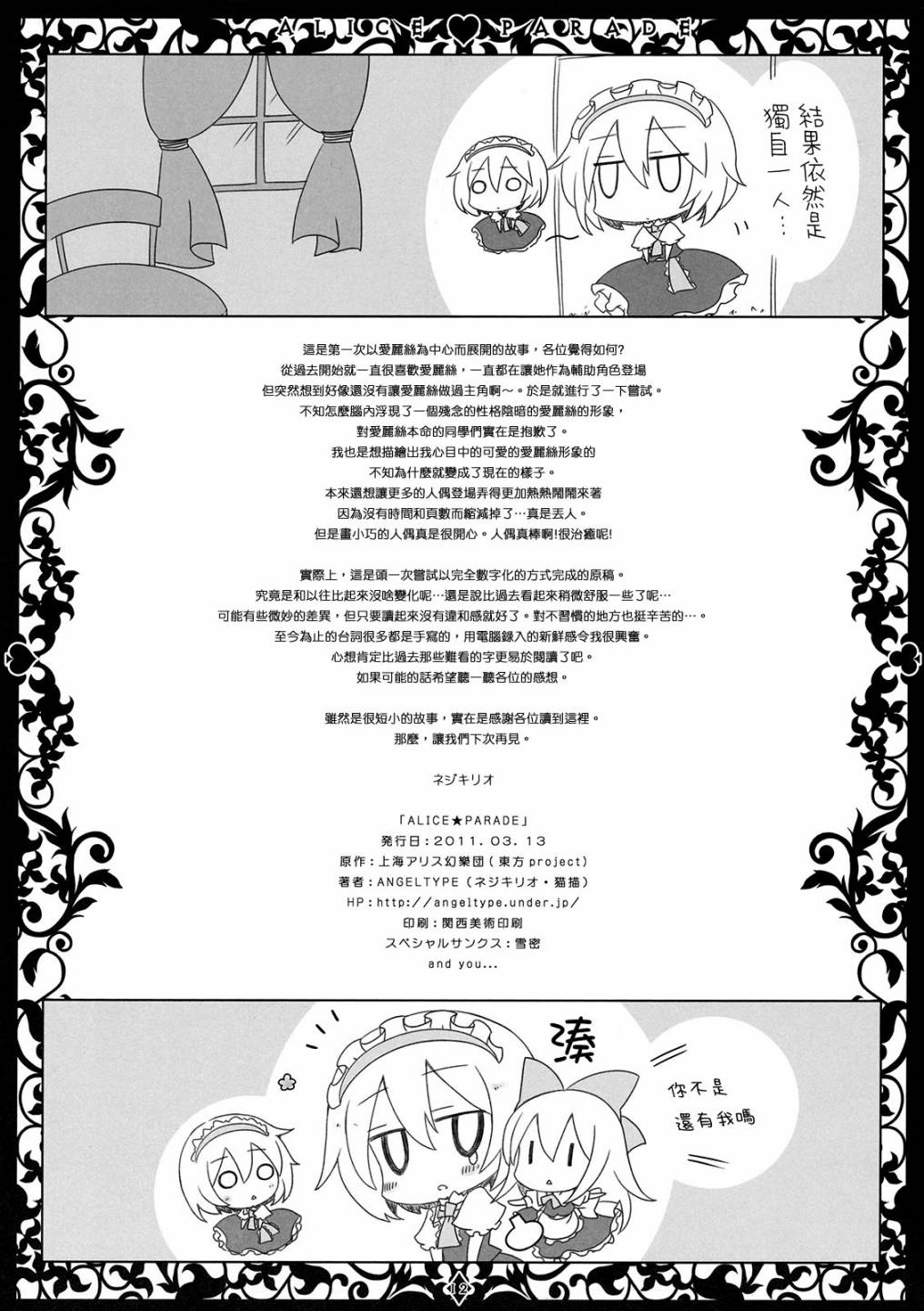 ALICE★PARADE01集漫畫來自網友分享和上傳,以便漫畫愛好者研究ALICE★PARADE01集漫畫畫法技巧和構圖方式。若喜歡漫畫,請支持購買正版!若侵犯到您的權益,請立即聯繫我們刪除