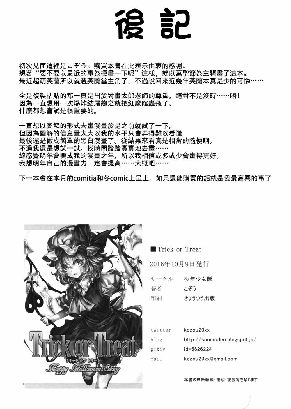 Trick or Treat短篇漫畫來自網友分享和上傳,以便漫畫愛好者研究Trick or Treat短篇漫畫畫法技巧和構圖方式。若喜歡漫畫,請支持購買正版!若侵犯到您的權益,請立即聯繫我們刪除