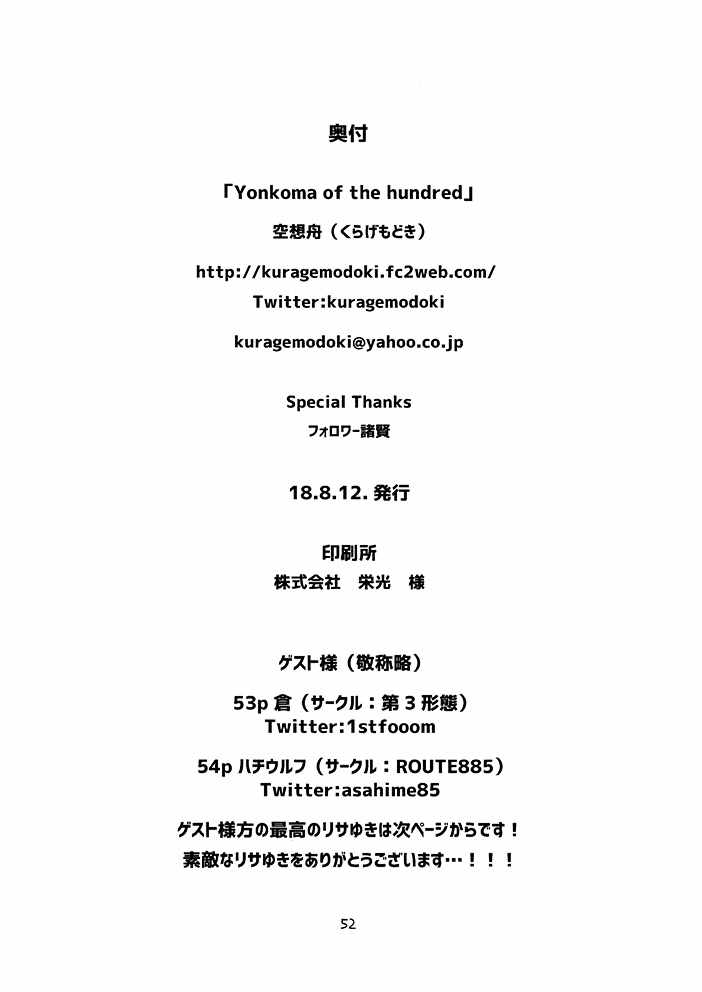 Yonkoma of the hundred漫畫來自網友分享和上傳,以便漫畫愛好者研究Yonkoma of the hundred漫畫畫法技巧和構圖方式。若喜歡漫畫,請支持購買正版!若侵犯到您的權益,請立即聯繫我們刪除